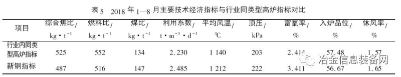 2018 年1—8 月新鋼2 500 m3 高爐主要技術(shù)經(jīng)濟(jì)指標(biāo)與行業(yè)內(nèi)同類型高爐指標(biāo)對(duì)比見表5。